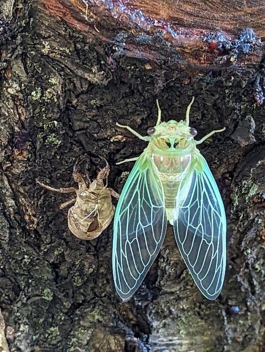 On the side of our ornamental peach tree, the wad of green I saw turned out to be a cicada that had just emerged from the shell of its former self. Its tail was scrunched in, and the lower three-fourths of its wings were still tightly curled into a loosening ball.
