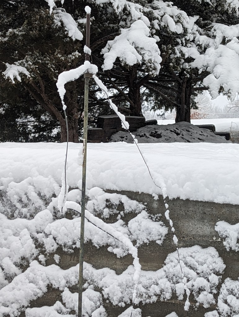One of the more impressive scenes, perhaps a bit oddly, was near the corner of the barn where I’d set up a solar powered electric fence charger last summer. I’d set a grounding post, a half-inch diameter metal rod, a few feet into the ground. Three feet of it still stands above the ground. When I moved the charger, I left that grounding rod in place along with the bare metal connecting wire still attached. It was so still and calm, and the snow an almost perfect degree of moisture, that nearly an inch of it accumulated on top of that bare wire!