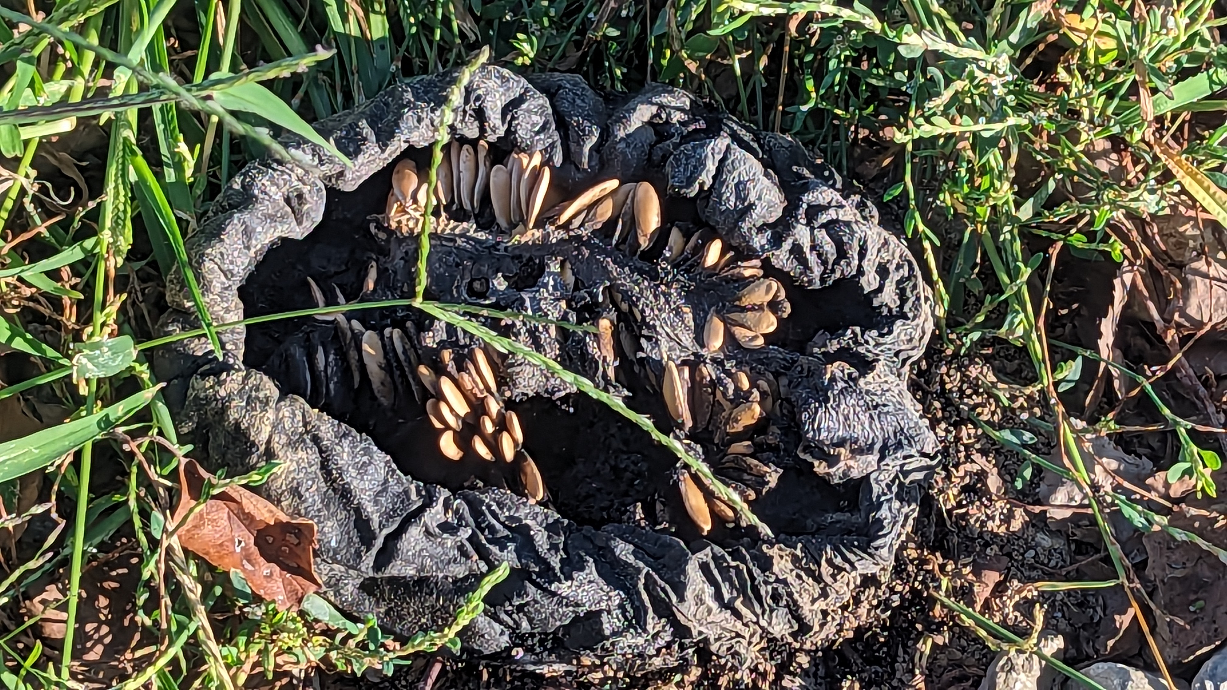 About a week later, I walked by the garden on my way to the horse barn. “What in thunderation is that ugly black thing?!” I wondered. I wondered this because I saw an ugly black thing, circular in shape and about six-to-eight inches wide sitting in the low grass at the edge of the garden. Then I saw the seeds and realized it was the greatly degraded carcass of the melon.