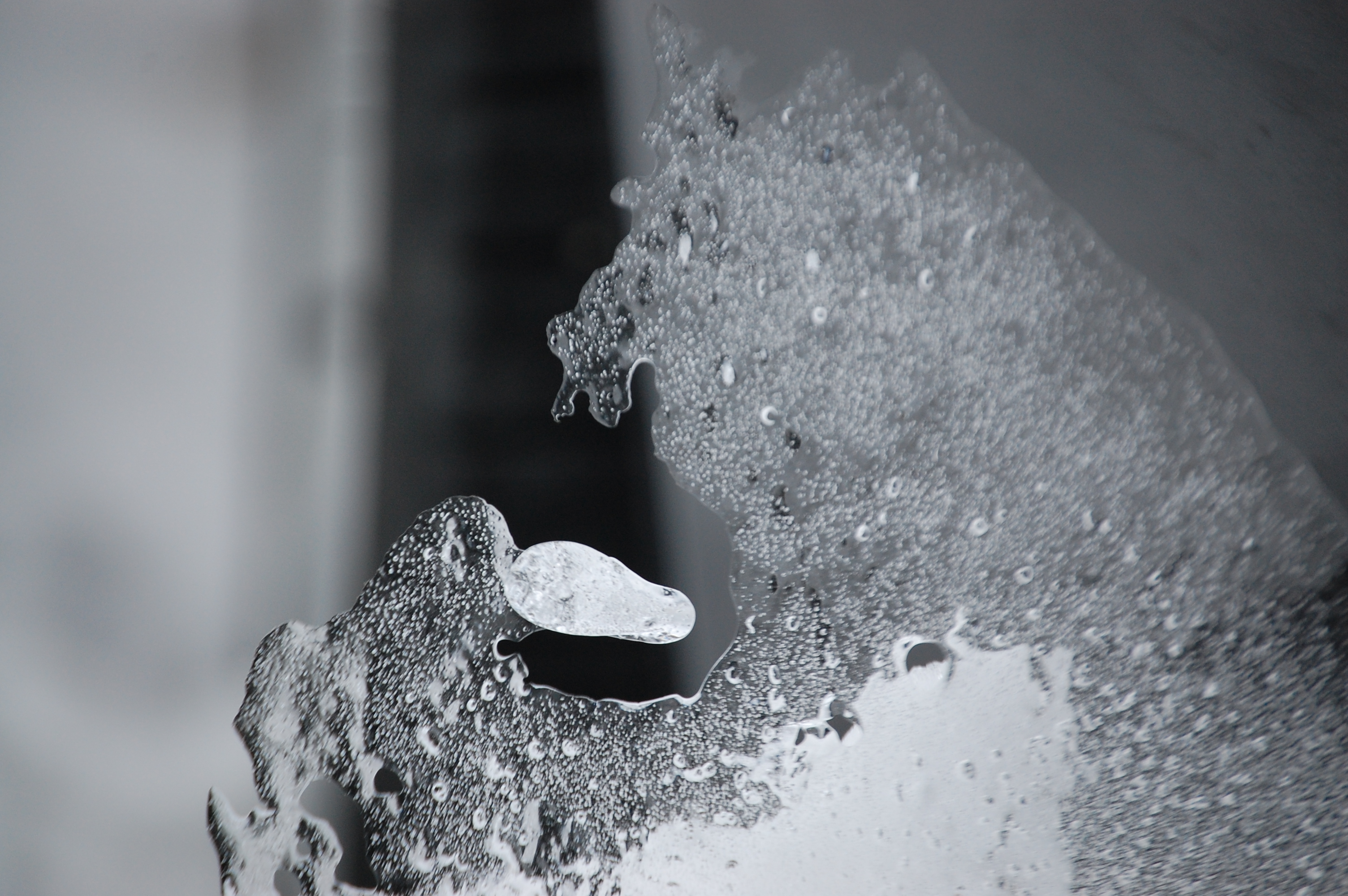 Also, a mysterious bulb of snow formed a circle inside the flat ice. At one point, the ice melted away from it, leaving a hollow halo around the snow bulb. This morning, with some additional slight melting during the night, even though it was ten degrees below freezing, one edge of the circle had vanished. Currently, the white intrusion looks like the head of a tiny ice alligator.