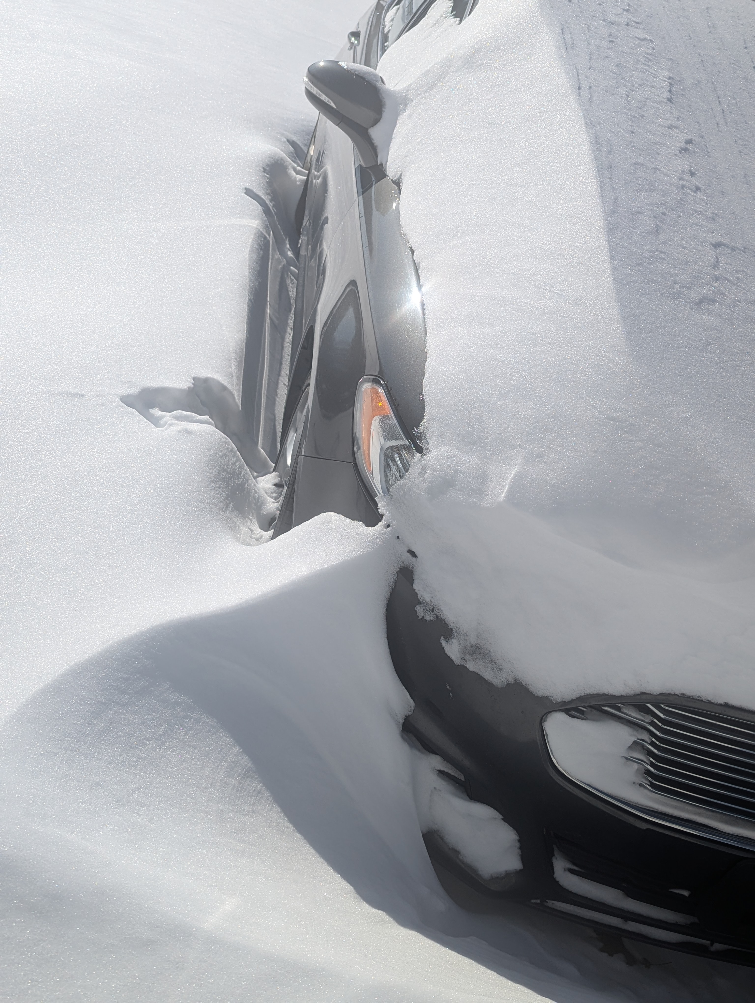 We watched throughout the day on the first Sunday of the new year as the snow piled up around the front of our vehicles. In particular, the sculpting at the front of our Ford Fusion became increasingly intriguing. By night, the drift curved up to the height of the headlight. The buffer zone maintained a shape more of less mirroring the front of the car. With temperatures holding well below freezing, the drifts held their shape for several days.