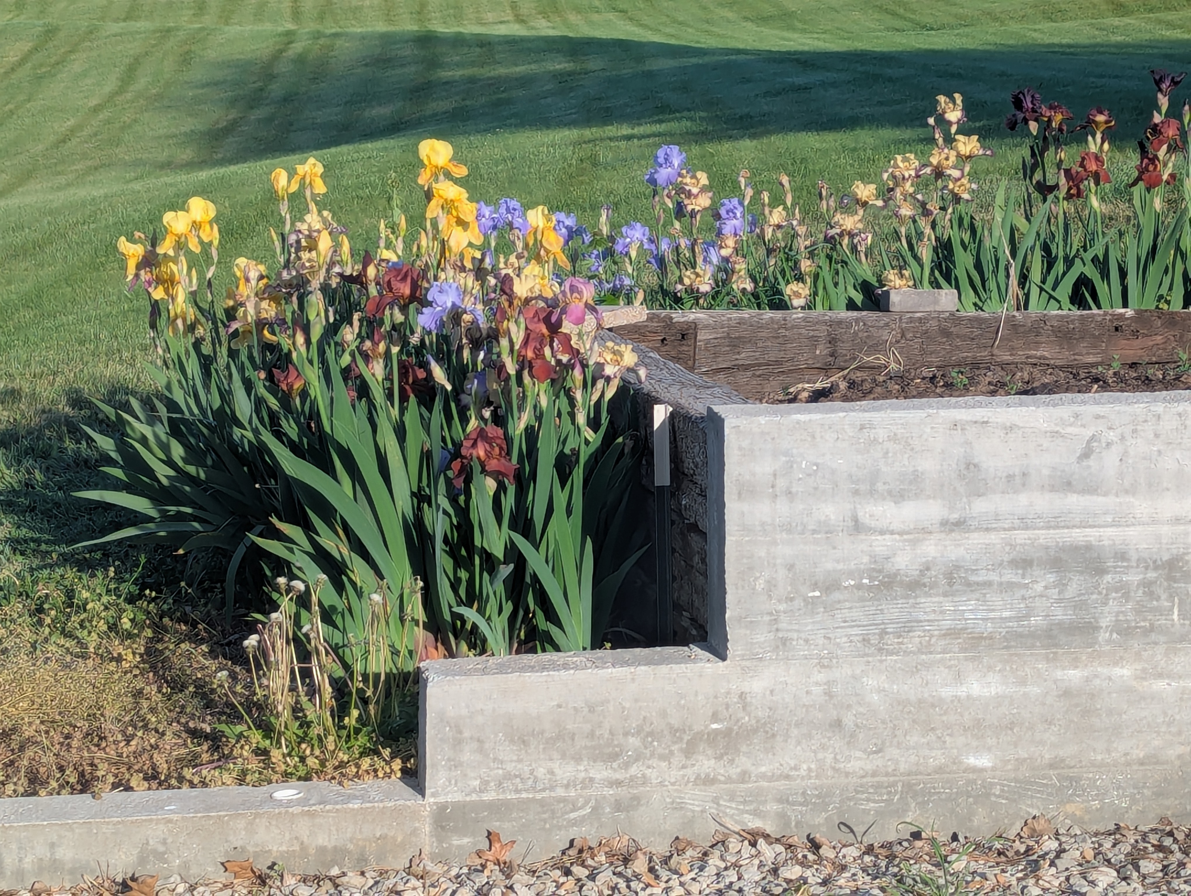 We have a fair variety of them here at our tiny place in northeast Kansas. Randa has a bed of dwarf irises near the back door. We have some clustered around the base of the locust tree and another small bed behind the garage. Two years ago, I planted a bunch of bulbs around the old crosstie frame of the compost bed by the barn. A few right by the barn and some in front of the concrete retaining wall.