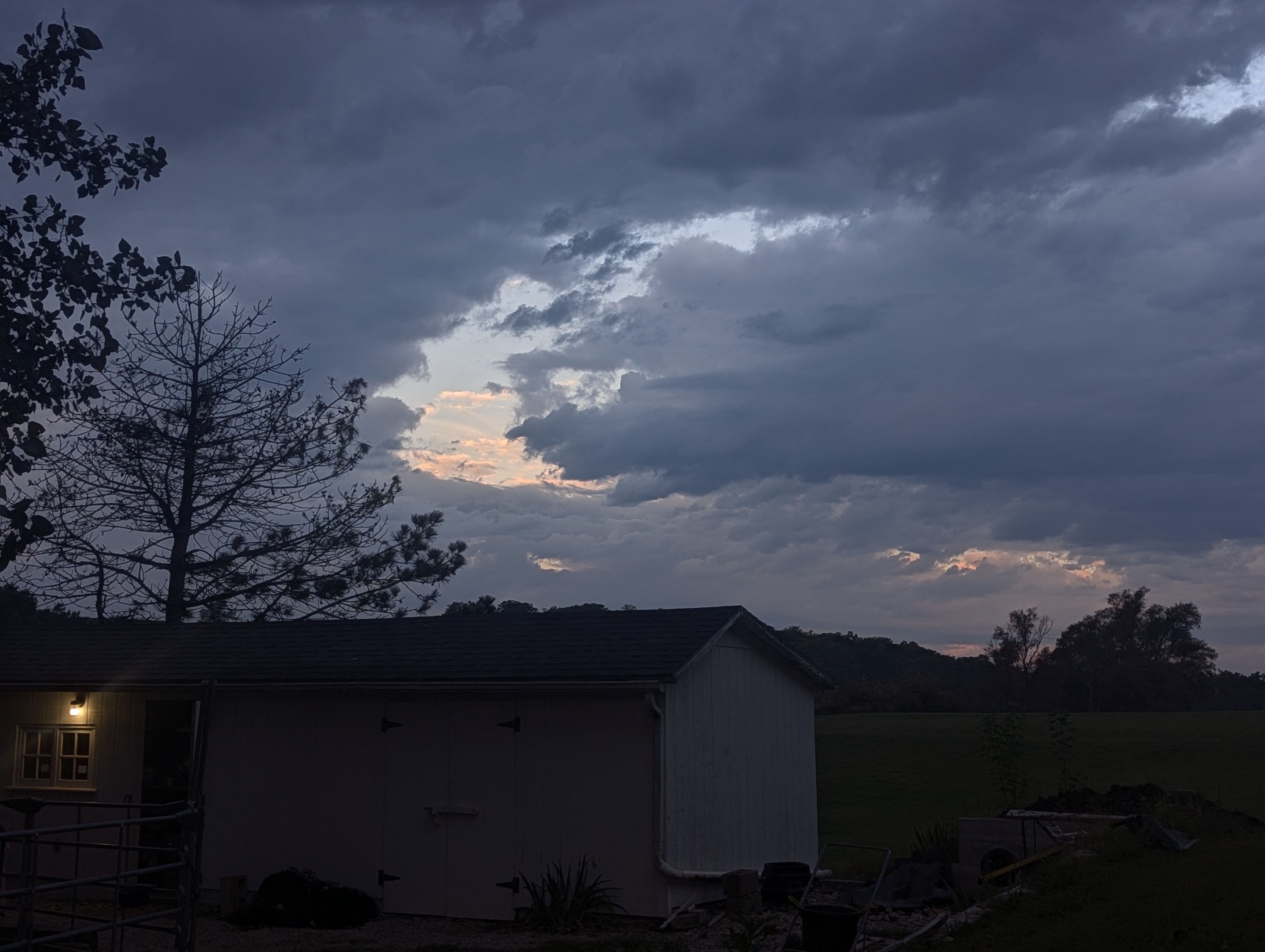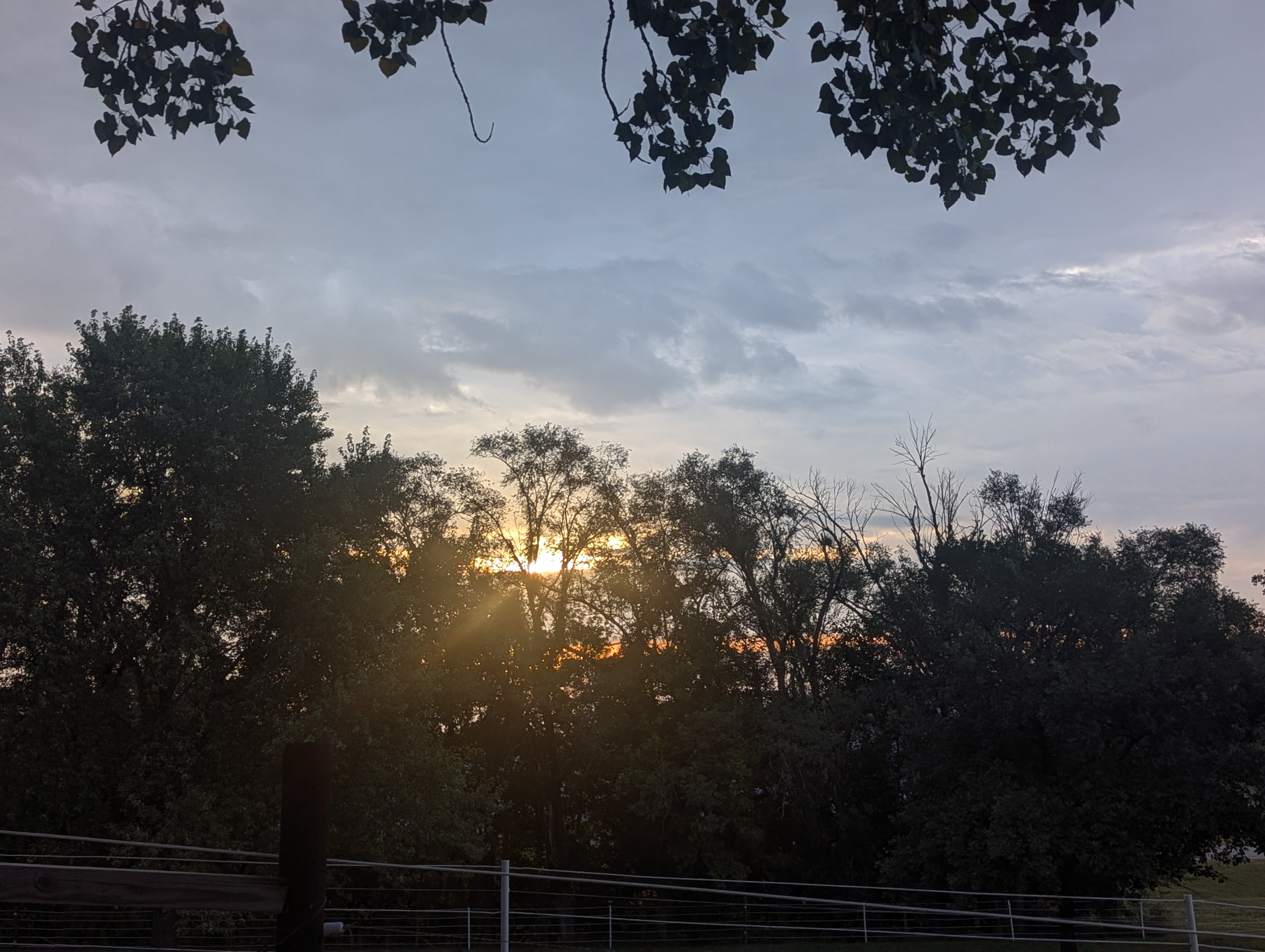 I like the way the morning sky bleeds through the branches of the elms in the thin row of trees lining the east side of the small pasture. I like the way morning clouds soften the rising of the sun but still let that slight red crescent shine through the break. I like the quiet stillness of the maples and mulberry while Randa and I move from place to place tending to the cleaning of pen and paddock. I like the way the horses stand still, lingering for a few minutes near us instead of trotting away to graze as soon as we slip the halters off. I like the muted blues and grays drifting slowly in over the ridge, hinting of rain but not threatening. I like the nearness of peace that speaks through the Spirit even in the nearness of turmoil and tragedy, reminding me that I am to love my neighbors and my enemies.